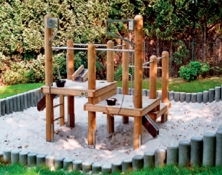 Bauwerksgerüst mit drei Spielebenen, PH 0,50 m / 0,75 m / 1,00 m, Leiter, 2 V2A-Sandaufzüge, 2 x Schüttrohre,
